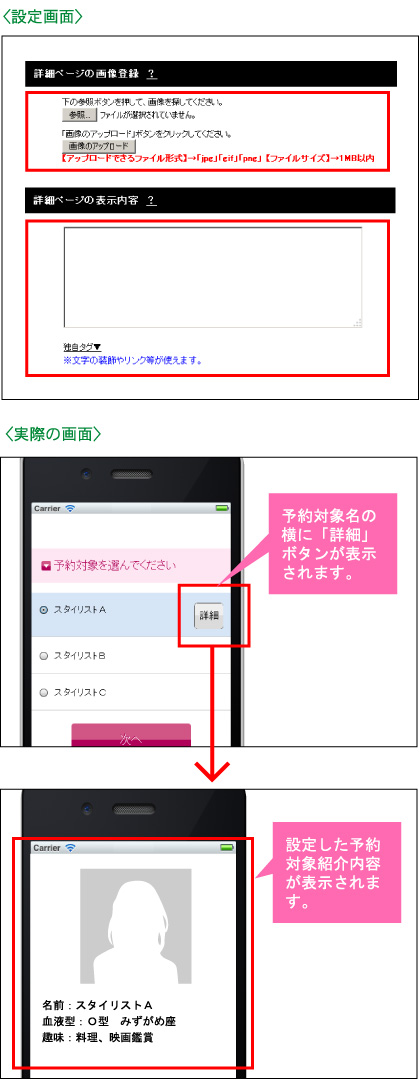 機能一覧 詳細ページ(予約対象) スタッフや講座などのプロフィールや詳細な内容の画像や案内文を表示することができます。 お客様が予約される際に、予約内容をわかり易く伝えることができます。 予約対象の詳細ページ スタッフや講座など予約対象の紹介ページの設定が可能です。 まずは使ってみてください! 予約システム利用までの流れ ご利用店舗様 お客様の声 資料ダウンロード 初期設定サポート 代理店制度 FAQ セキュリティーへのこだわり 初心者の方にもやさしい安心サポート