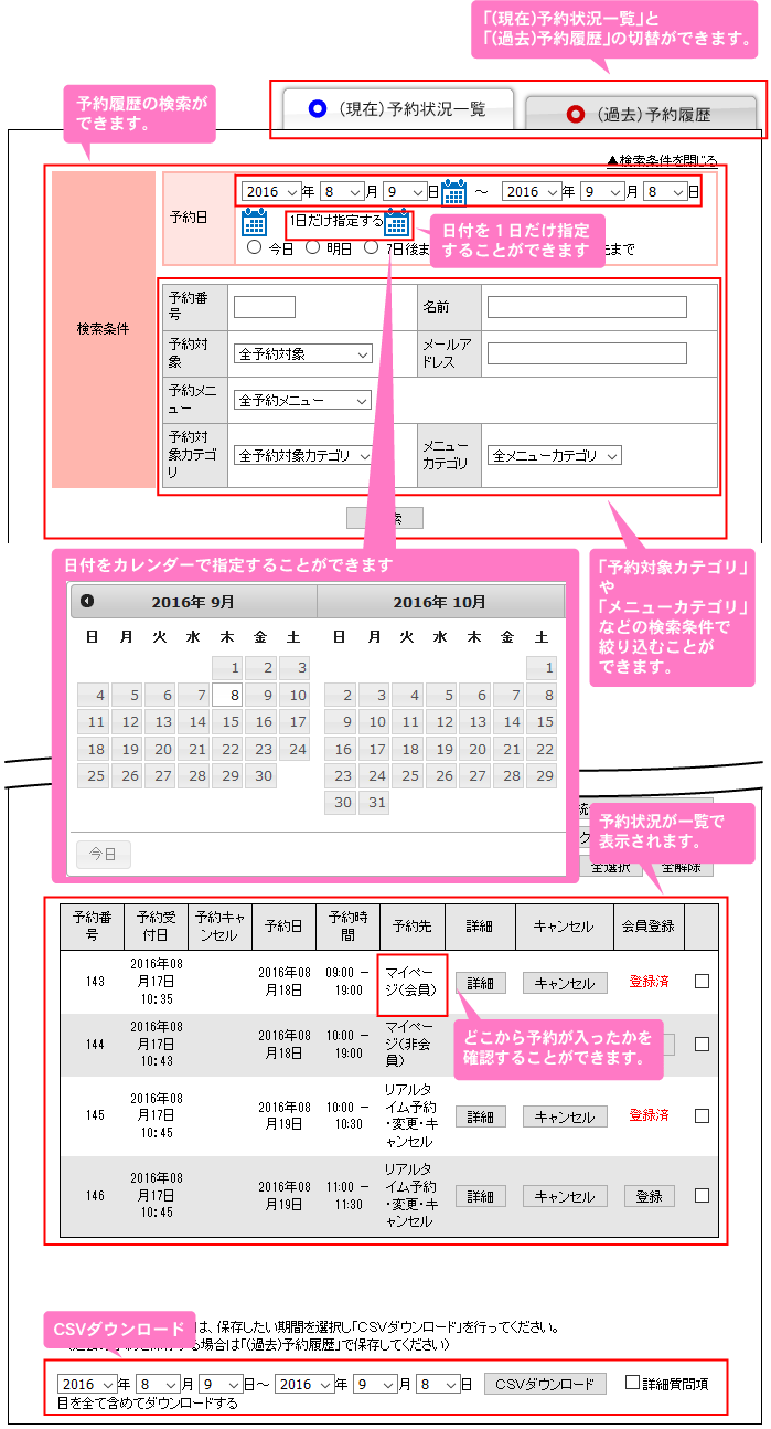受付けた予約が一覧で表示されます。予約状況閲覧の他、予約の検索、CSVダウンロードも可能です。