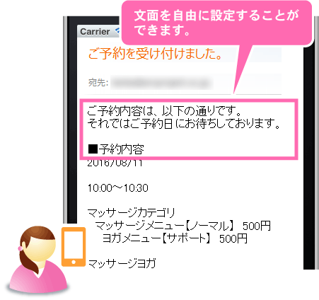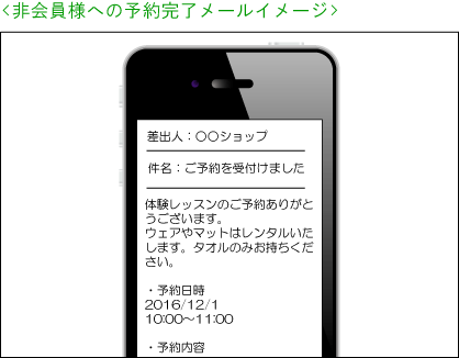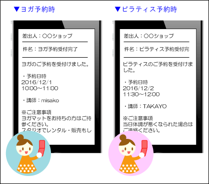 「ヨガ用の予約完了メール」「ピラティス用の予約完了メール」という風に、予約対象ごとに予約完了メールの内容を変更できます。