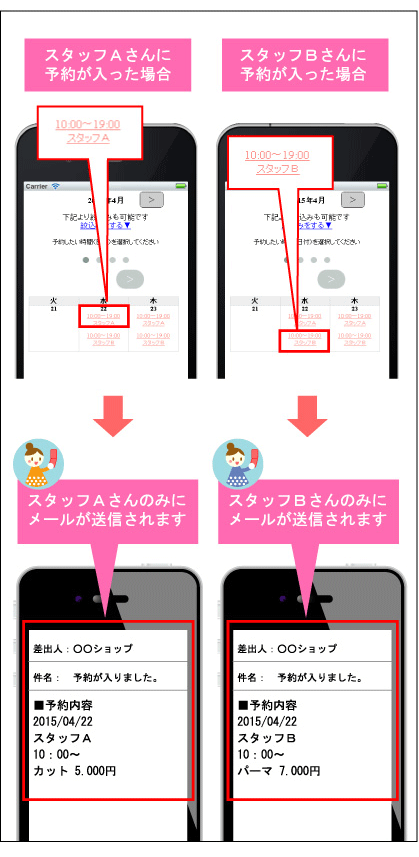 「スタッフA」さんの予約が入った場合は「Aさん」のみに 、「スタッフB」さんに予約が入った場合は「Bさん」のみに予約通知メールを送る、という設定もできます。