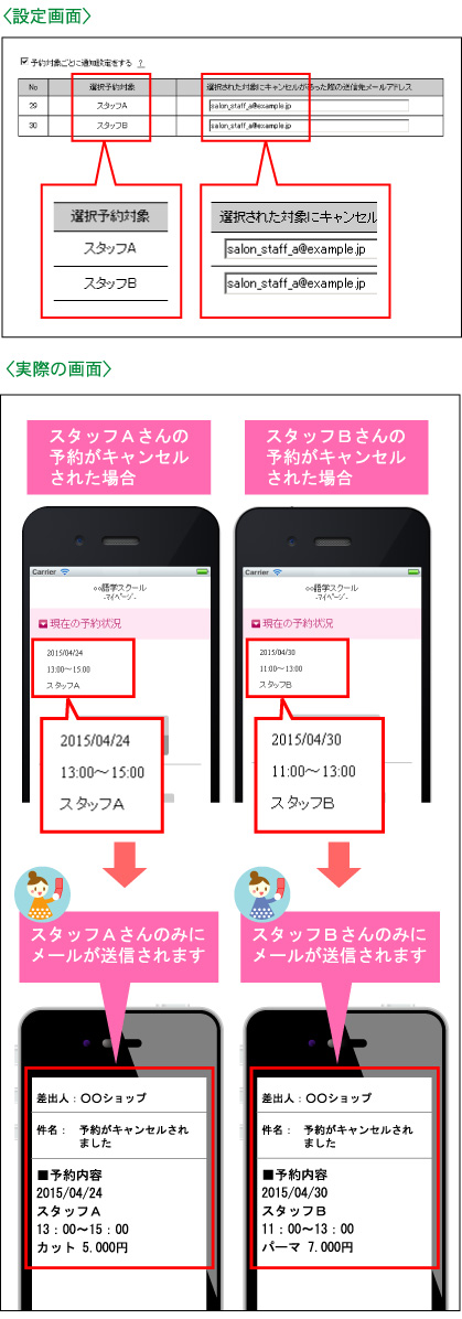 例:「スタッフA」さんの予約がキャンセルされた場合は「Aさん」のメールアドレスへ、「スタッフB」さんの予約がキャンセルされた場合は「Bさん」のメールアドレスへキャンセル通知メールを送ることが可能です。
