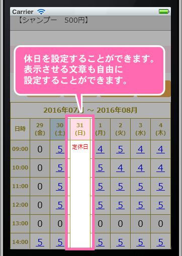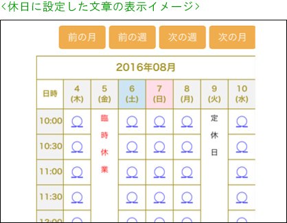 休日の部分に、「定休日」や「臨時休業」などの文章を表示できます。