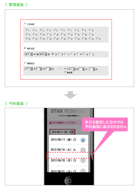 ・日別指定、曜日指定、期間指定、カレンダー指定で休日を設定することができます。