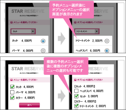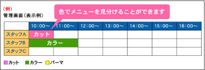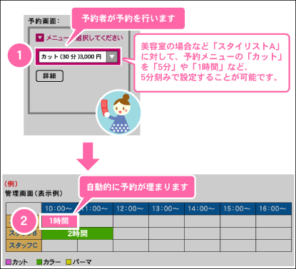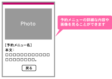 機能一覧 予約メニュー設定 「カット」や「カラー」といったサービス名や、「英会話初級」、「フランス語中級」といったレッスン名などを作成することができます。 「予約メニュー所要時間」を設定することが可能です。 メニューに対して料金の設定を行うことができます。 管理画面での予約メニューを色で識別することができます。 詳細はこちら メニューに対して「オプションメニュー」の設定ができます。 詳細はこちら 「詳細ページ」の作成が可能です。 詳細はこちら まずは使ってみてください! 予約システム利用までの流れ ご利用店舗様 お客様の声 資料ダウンロード 初期設定サポート 代理店制度 FAQ セキュリティーへのこだわり 初心者の方にもやさしい安心サポート