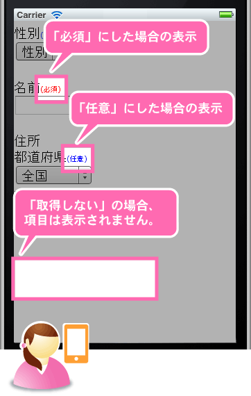 また、それぞれの取得項目に対して、「必須で取得」「任意で取得」「取得しない」を設定することができます。