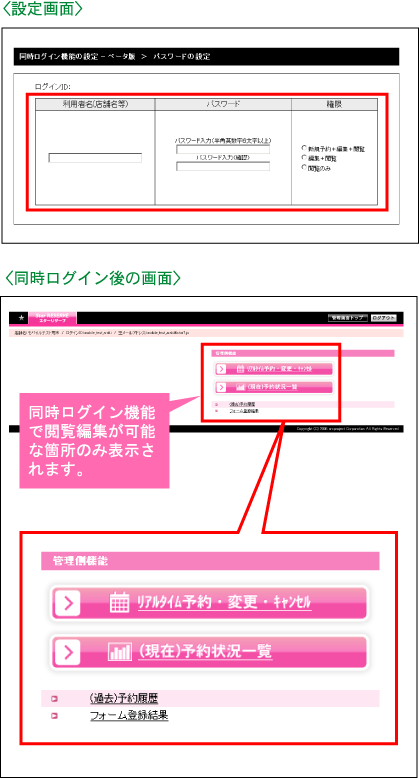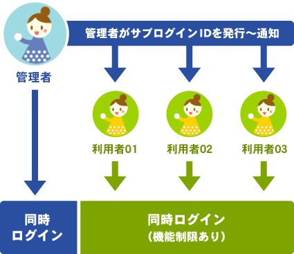 同時ログイン機能とは、管理画面に複数人でアクセスできる機能です。「管理者」とは別に「サブのログインID」を発行し同時にログインすることができます。