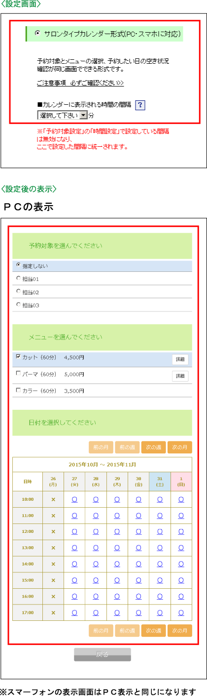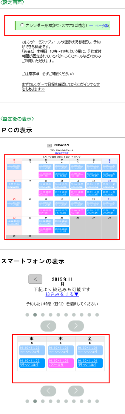 ※カレンダーは、予約日時が固定されている(スクール向け)カレンダーと、予約日時が変動する(サロン向け)