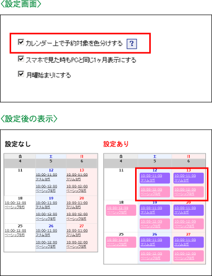 色分け設定を行なうことで、予約内容がが区別されよりわかり易くなります。