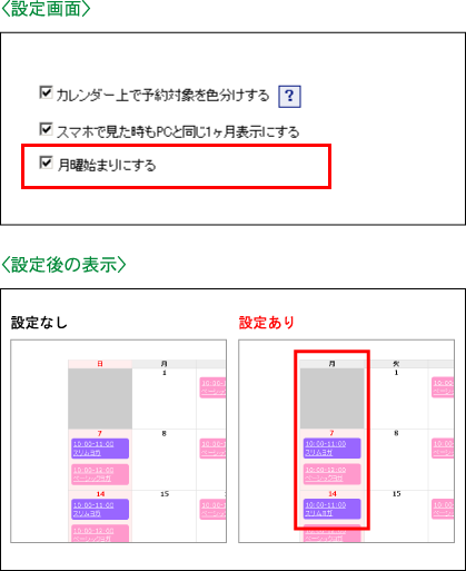 通常のカレンダー表示では、開始曜日「日曜日」から表示されますが、業務形態に合わせ「月曜日」始まりにすることができます。