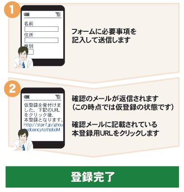 会員登録情報を入力後確認メールが返信されてきます。返信されたメール本文内のURLをクリックすることで、登録が完了するた、めいたずら目的のメールを防ぐことができます。