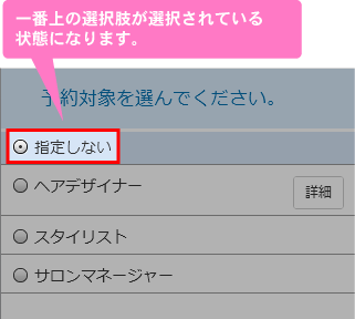 予約画面で予約のメニューや時間などを選択する際、通常一番上のメニューが必ず選択された状態になります。