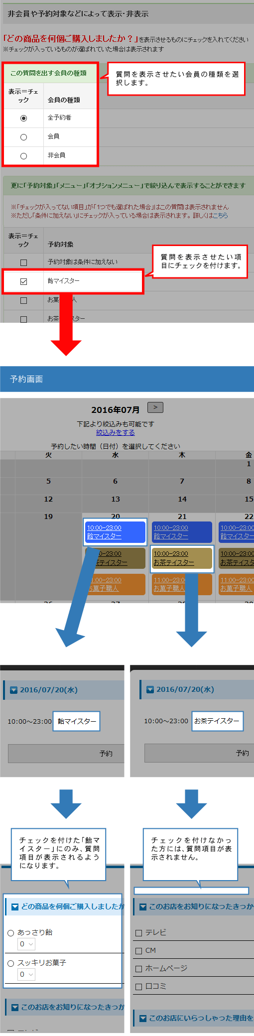予約の際、予約内容とは別に質問やアンケートを取得するページを設置することができる機能です。質問の回答形式も「単一形式」「複数選択形式」「文字(1行)」「文字(複数行)」の形式から選択することができ、予約対象や会員・非会員などによって質問を表示する、しないといった設定をすることも可能です。