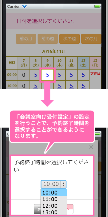 機能一覧 会議室向け受付設定 「会議室向け受付設定」とは、予約の際に予約終了時間が選択できるようになる機能です。例えば午前10時から午後1時までの利用予約を入れたい場合に対応することができます。 まずは使ってみてください! 予約システム利用までの流れ ご利用店舗様 お客様の声 資料ダウンロード 初期設定サポート 代理店制度 FAQ セキュリティーへのこだわり 初心者の方にもやさしい安心サポート