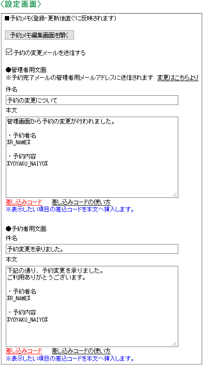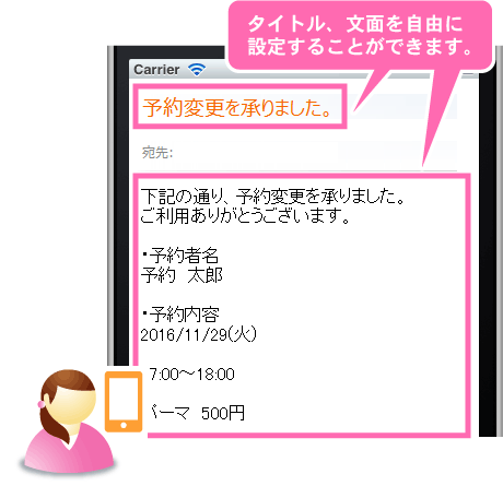 機能一覧 管理画面から予約変更時、個別にメールを送信 管理画面から予約の変更を行ったとき、個別にお知らせメールを送信することができます。 管理者と予約会員の両方にメールを送ることができます。 メールタイトルやメール文面内容を自由に設定することができます。 予約の変更メールを送信する 管理者用文面と予約者用文面の2種類を作成することができます。 差込コード メール本文内に「予約名」や「予約メールアドレス」などが表示されるようになる「差込コード」が挿入できます。 まずは使ってみてください! 予約システム利用までの流れ ご利用店舗様 お客様の声 資料ダウンロード 初期設定サポート 代理店制度 FAQ セキュリティーへのこだわり 初心者の方にもやさしい安心サポート