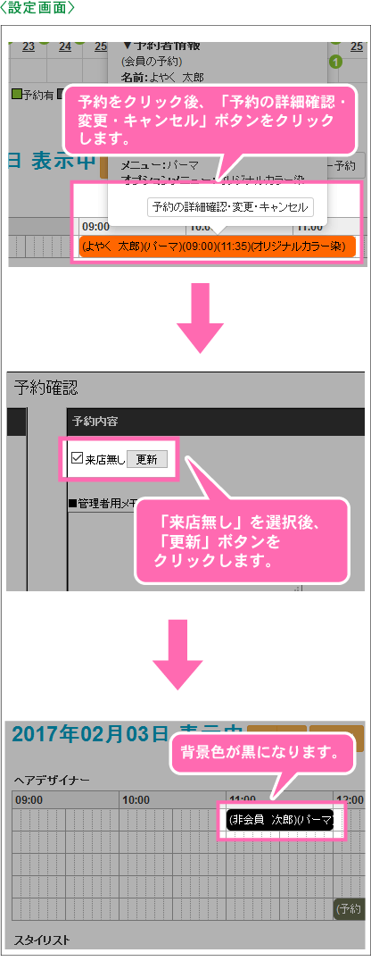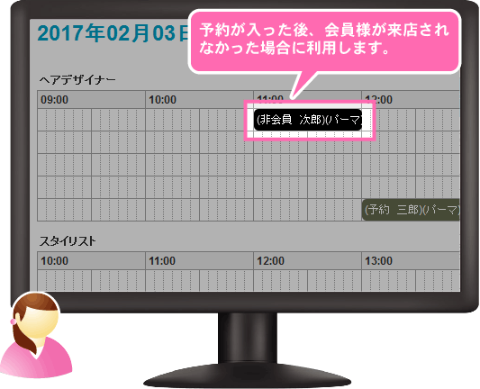 機能一覧 来店無し機能 来店無し機能とは、予約会員様から予約が入った後に予約会員様の来店が無かった場合に使用します。 設定の流れ 設定後、予約欄の背景色が黒に変更されます。 まずは使ってみてください! 予約システム利用までの流れ ご利用店舗様 お客様の声 資料ダウンロード 初期設定サポート 代理店制度 FAQ セキュリティーへのこだわり 初心者の方にもやさしい安心サポート
