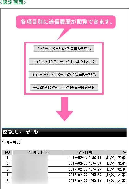 機能一覧 自動返信メールの送信履歴 自動返信メールの送信履歴とは、予約受付が完了した場合や予約がキャンセルされた場合などに送信されるメールの履歴を閲覧することができる機能です。 送信履歴閲覧の流れ 並替えや閲覧データのダウンロードが行えます。 まずは使ってみてください! 予約システム利用までの流れ ご利用店舗様 お客様の声 資料ダウンロード 初期設定サポート 代理店制度 FAQ セキュリティーへのこだわり 初心者の方にもやさしい安心サポート