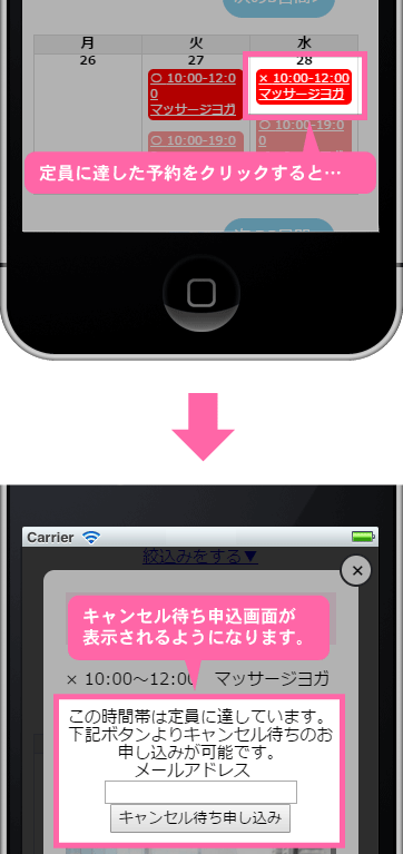 定員に達している予約項目をクリックした場合に、キャンセル待ち申込が行えるようにする機能です。