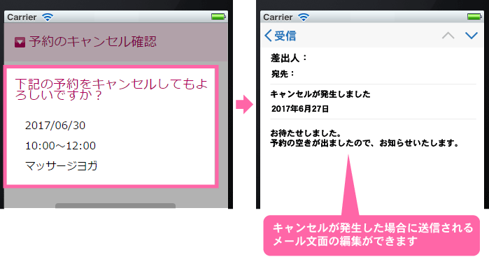 キャンセルが発生した時に送信される文面を自由に編集することができます。