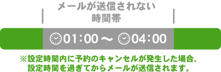設定した時間内には、キャンセルが発生した時のメールが送信されなくなります。 設定した時間内にキャンセルが発生した場合は、設定時間外になるとメールが送信されます。