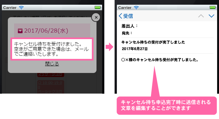 キャンセル待ちの受付が完了した時に送信される文面を自由に編集することができます。