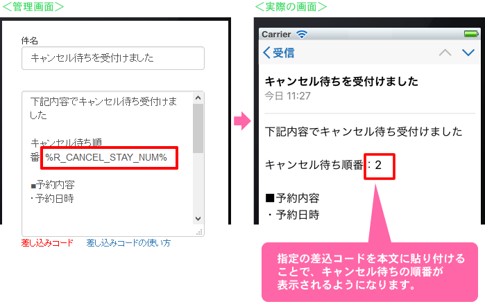 キャンセル待ちの順番がわかるようになるコードを差し込むことができます。