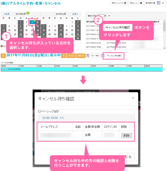 「(新)リアルタイム予約・変更・キャンセル」の画面で、キャンセル待ち申請中の方の確認・削除ができます。