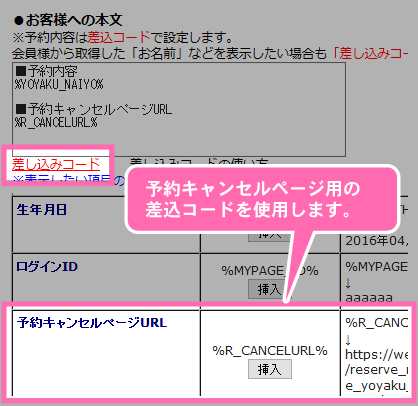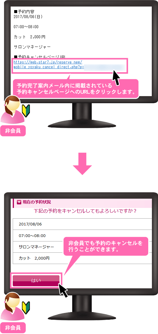 機能一覧 非会員でもキャンセルできる機能 予約完了メール本文中に非会員用の予約キャンセルURLを記載することで、非会員でも予約のキャンセルが行えるようになります。 予約完了メール 予約完了時に非会員の予約者へ自動で送られるメールです。 差込コード 予約キャンセルページURL用の差込コードを使用して、非会員でも予約キャンセルが行えるようにします。 まずは使ってみてください! 予約システム利用までの流れ ご利用店舗様 お客様の声 資料ダウンロード 初期設定サポート 代理店制度 FAQ セキュリティーへのこだわり 初心者の方にもやさしい安心サポート