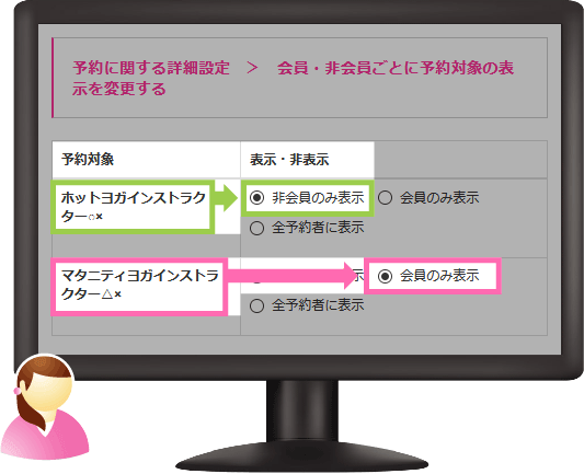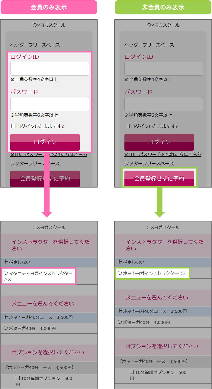 機能一覧 会員・非会員ごとに予約対象の表示を変更する 予約対象ごとに「非会員」「会員」「全予約者」のいずれか1つを選択して表示させることができます。 マイページでの表示例 上図のように、予約会員としてログインした場合と非会員として予約ページを表示させた場合、予約対象の表示が変わります。 まずは使ってみてください! 予約システム利用までの流れ ご利用店舗様 お客様の声 資料ダウンロード 初期設定サポート 代理店制度 FAQ セキュリティーへのこだわり 初心者の方にもやさしい安心サポート