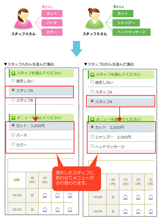 機能一覧 対象ごとに表示するメニューを変更 対象ごとに表示されるメニューを変更することが出来ます。 スタッフごとに施術メニューが違う場合、お店ごとに提供しているサービスが違う場合などに便利な機能です。 スタッフごとに表示メニューを変更する場合のイメージ お店ごとに表示メニューを変更する場合のイメージ まずは使ってみてください! 予約システム利用までの流れ ご利用店舗様 お客様の声 資料ダウンロード 初期設定サポート 代理店制度 FAQ セキュリティーへのこだわり 初心者の方にもやさしい安心サポート