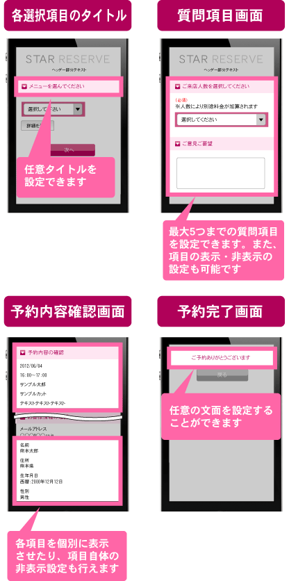 予約開始〜完了までの画面内に表示する見出しや文面を設定できます。