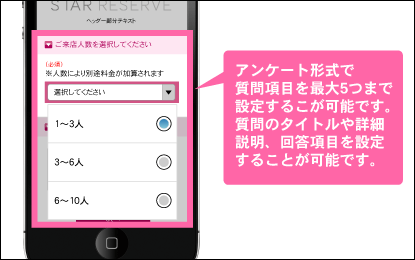 各項目選択画面のタイトル設定や会員情報の取得項目設定、質問項目などのを行うことができます。