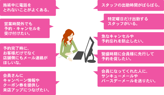 業種別活用例 スクール・教室の場合 美容室・サロンの場合 その他の場合 業種別活用例 2.美容室・サロンの場合 予約の流れ 1スタッフを選択 2受けたいサービスを選択 3日にちを選択 4時間を選択 予約画面イメージ << 前の画面へ 次の画面へ >> 対応業種 美容室、サロン、エステ、整体、診療 対応可能なスケジュール例 美容室の場合 よくある要望 まずは使ってみてください! 予約システム利用までの流れ ご利用店舗様 お客様の声 資料ダウンロード 初期設定サポート 代理店制度 FAQ セキュリティーへのこだわり 初心者の方にもやさしい安心サポート