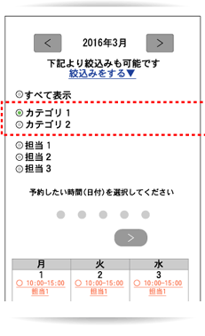 予約カレンダーの「絞込みをする」に「予約対象カテゴリ設定」で設定した「カテゴリ名」の選択肢を表示し、カテゴリで絞込みをすることが可能になります。